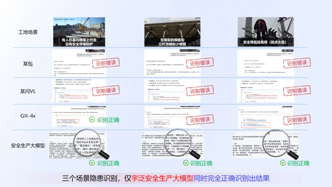 更重要的是,U安智巡背后所依托的安全生产大模型已通过近百万条高标注数据的训练和持续迭代,具备了极强的专业识别能力和场景适应力。模型不仅通过了大量真实场景的检验,还借助仿真环境生成技术和专家评估机制不断自我优化,在多个高危行业的隐患识别准确率和完整率上,已表现出超越通用大模型和部分行业专用模型的能力。正是这一深厚的技术积累与场景理解能力,支撑起了宇泛“全域安全智能监测平台”的功能实现与行业落地。