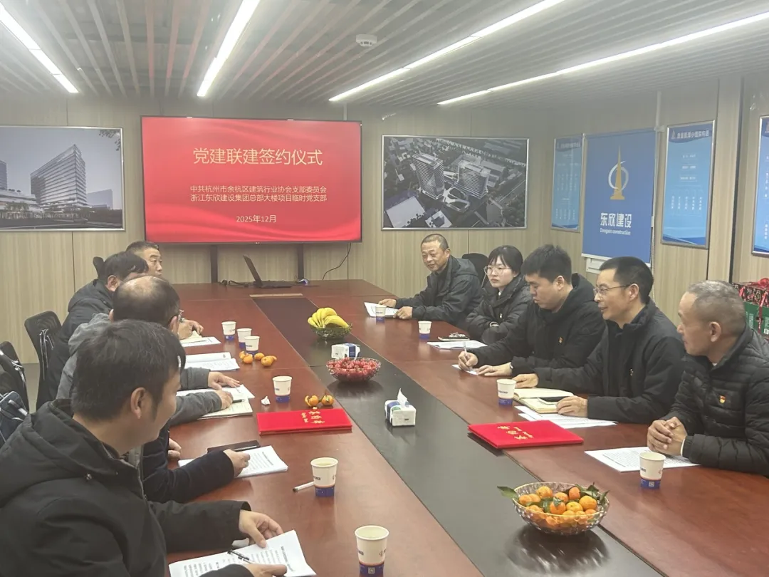 为深入学习贯彻党的创新理论,加强行业协会与企业党建工作交流,12月30日下午,杭州市余杭区建筑行业协会党支部书记徐海钢带领协会党员一行五人,前往东欣建设集团总部项目部,与项目临时党支部共同开展党建联建活动,重点学习党的二十届四中全会精神,并就今后的党建活动进行签约。
