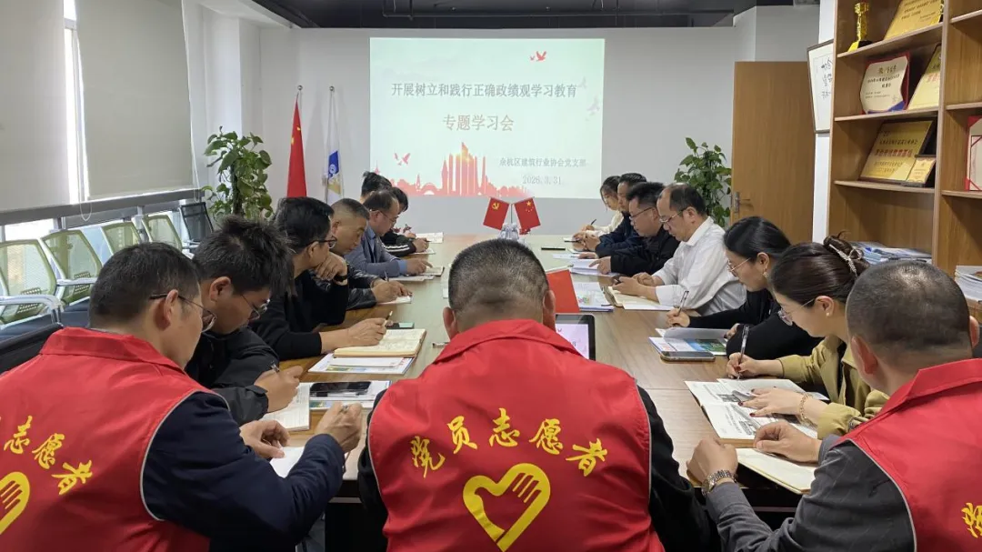 2026年3月31日下午,余杭区建筑行业协会党支部牵头组织常升建设集团有限公司、蓝宸数联科技有限公司、中建三局集团有限公司等10多名会员单位及项目党支部党员代表,开展《习近平关于树立和践行正确政绩观论述摘编》(以下简称《论述摘编》)专题联学活动。协会党支部书记徐海钢主持会议,强调要以正确政绩观引领行业高质量发展,推动党建与业务深度融合。